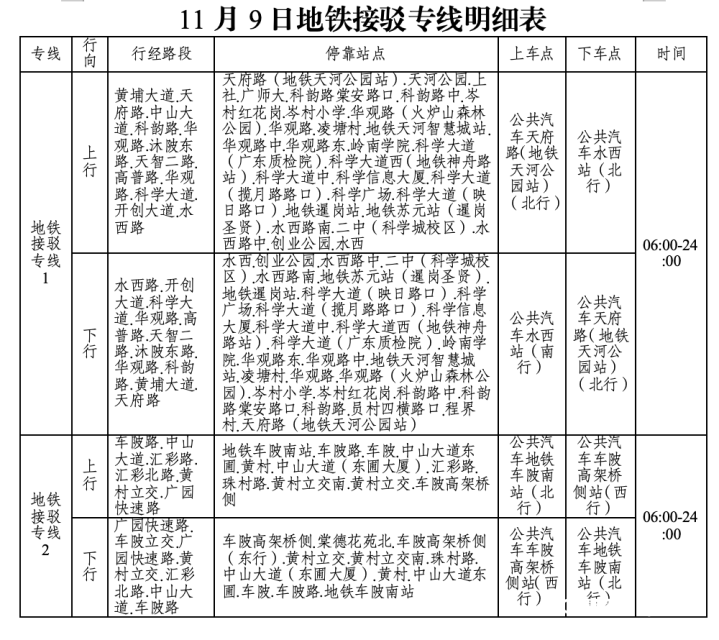 广州公交集团特别提醒,开幕式当天,将开行两条地铁接驳专线。